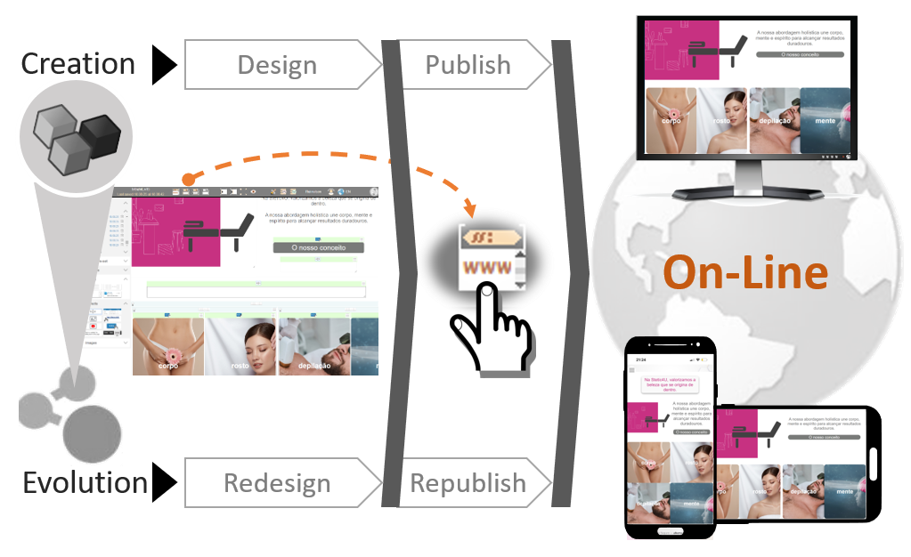 Desenho de Sites, Publicação 1 Click, Execução on-line, Multidevice, Multilíngua